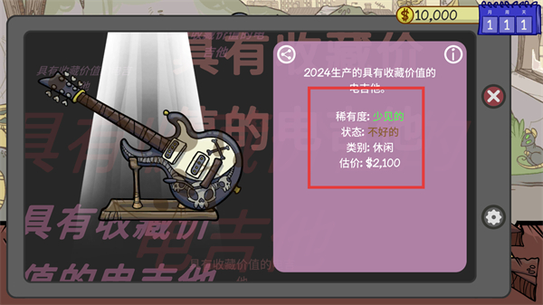 2、查看【电吉他】的详情面板,关注【稀有度-少见的】【状态-不好的】信息,评估其交易价值。