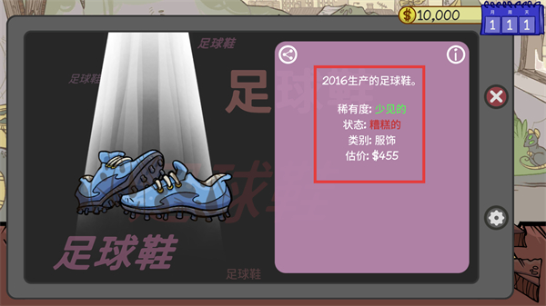 4、查看【足球鞋】的详情,注意【状态-糟糕的】【估价-455】信息,判断是否值得交易。
