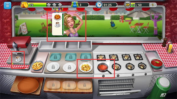 1、关卡设计丰富多样且充满挑战,每个地区都有独特的订单要求和时间限制,需要合理规划烹饪顺序确保顾客满意度。