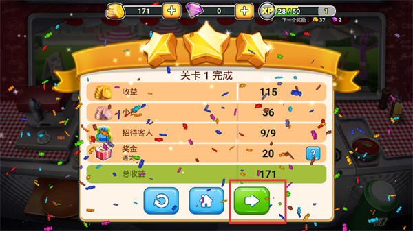 4、关卡完成后,点击【绿色箭头】按钮进入下一关。