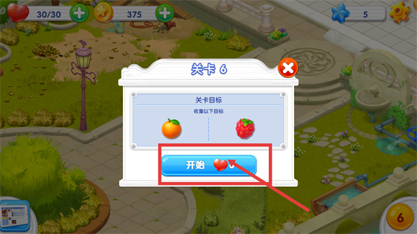1、进入关卡后查看目标为收集橙子与草莓,点击开始按钮挑战,完成目标可推进剧情解锁后续内容。