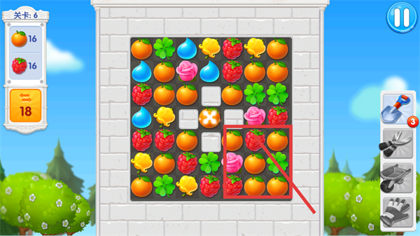 2、在消除界面将相同的橙子元素组合消除,积累进度以达成当前关卡目标。