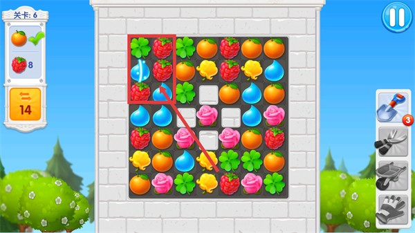 3、优先消除未完成收集的草莓,利用相邻的蓝色水滴移动组合能更高效推进关卡进度。