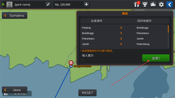 1、在路线界面选定出发与目的地城市,点击【出发!】开启运输行程,完成后可获得收益。