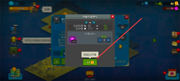 4、确认材料与资源充足,点击升级按钮,完成作战单位的等级提升。