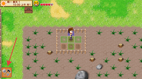 1、用锄头开垦农田空地后,点击箭头所指方向,打开种子背包,推进作物种植流程。