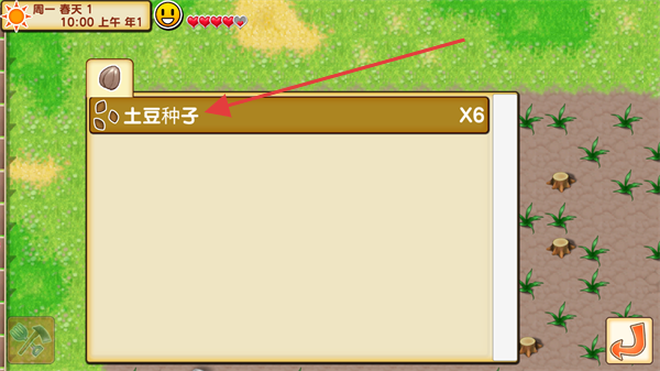 2、在背包界面选中【土豆种子-X6】,确认后可将种子用于农田播种,开启作物培育的牧场经营环节。