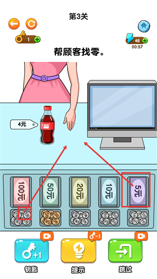 2、第3关需完成【帮顾客找零】任务,商品定价【4元】,顾客支付【10元】,需计算找零金额后选择对应货币。