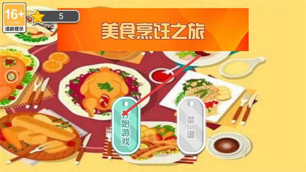 1、在【美食烹饪之旅】主界面,点击【开始游戏】按钮进入关卡,也可通过【菜谱】查看菜品制作参考。