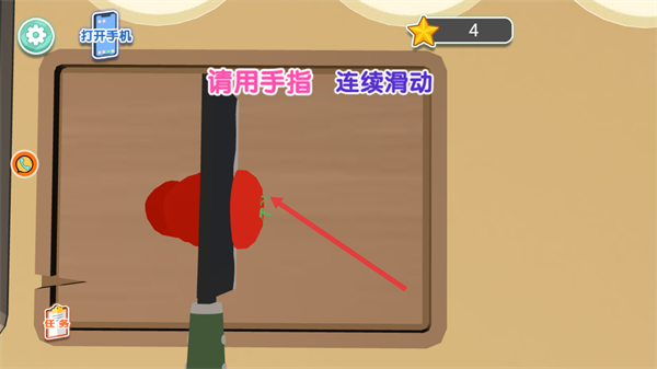 3、处理西红柿时,根据提示用手指连续滑动刀具,完成食材的切割操作,推进料理阶段任务。