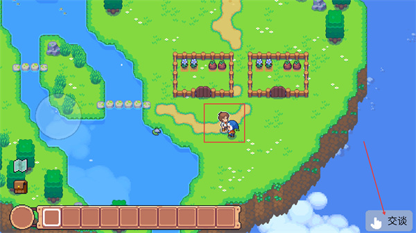 3、移动至农田区域,点击界面的【交谈】按钮,与场景中的角色互动,推进游戏流程。