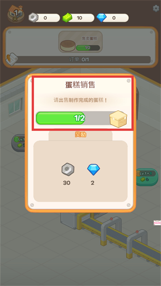 1、打开蛋糕销售订单后,需销售2块蛋糕才能领取奖励,积累资源用于后续设备升级。
