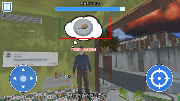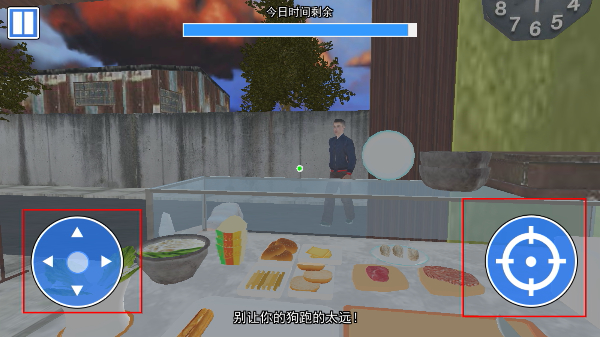 2、进入场景后,用【方向按钮】操控角色移动,借助【瞄准按钮】交互餐品,准备为顾客提供服务。