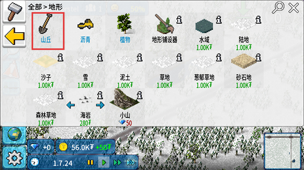 1、在地形选择界面,选中【山丘】可调整指定区域地形,需确保资源充足以完成修改。
