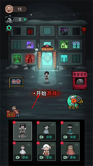 1、打开该恐怖宿舍游戏,找到界面中的开始游戏按钮,点击该按钮进入模式选择界面。