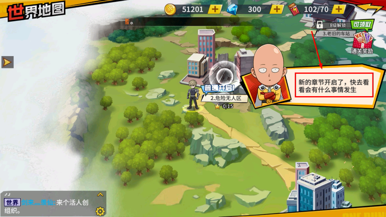 1、新章节开启后,可前往【危险无人区】区域,点击对应位置开启普通难度的关卡挑战。