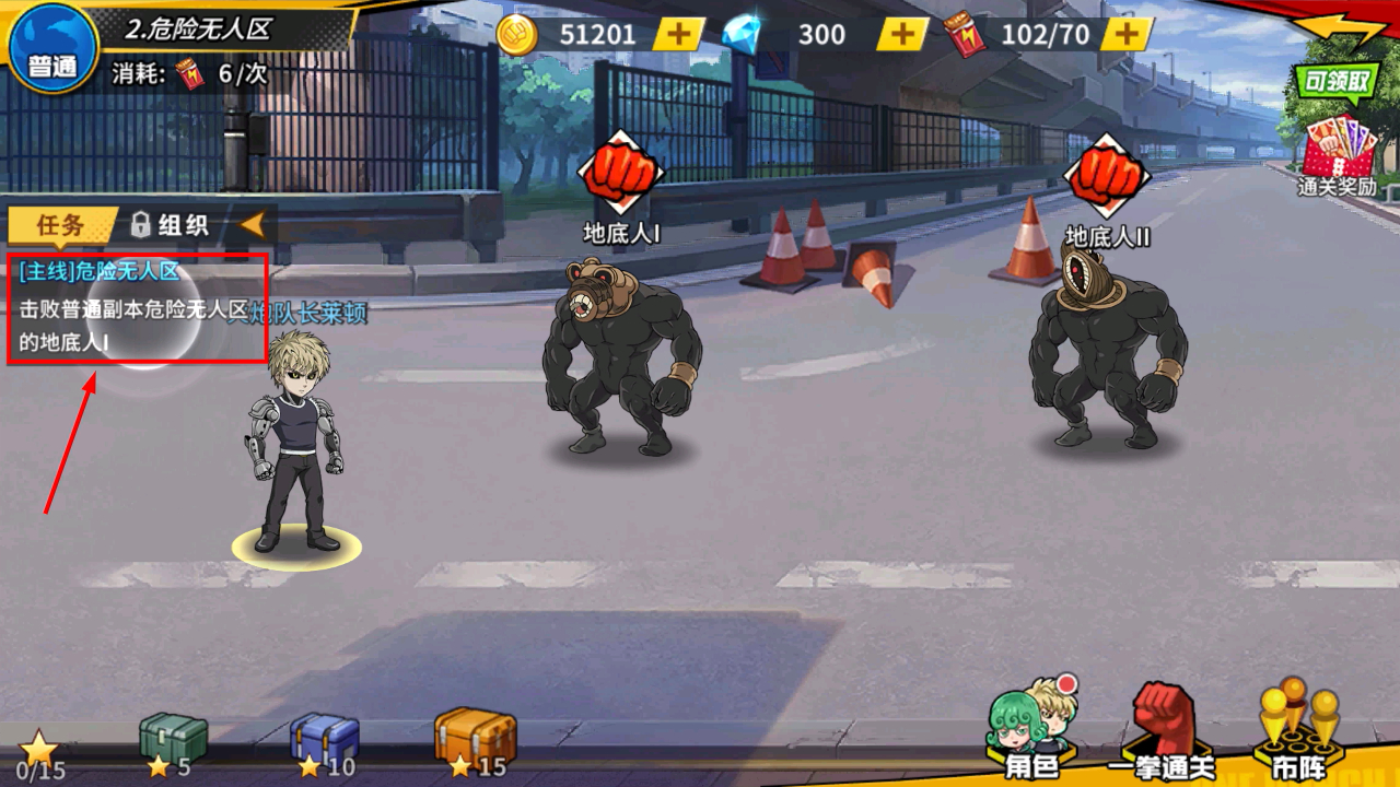 3、关卡内主线任务为击败【危险无人区】的地底人,需优先规划战斗策略。