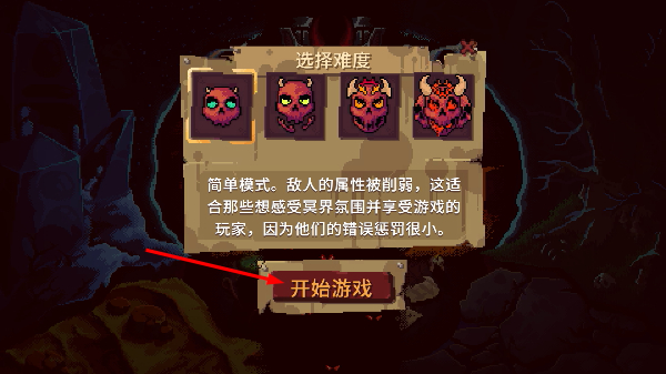 1、在【选择难度】界面选【简单模式】,其敌人属性削弱,选后点【开始游戏】进入。