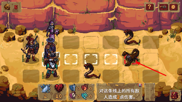 2、战斗时利用技能对横线上所有敌人造成【2点伤害】,合理瞄准敌方单位推进战局。