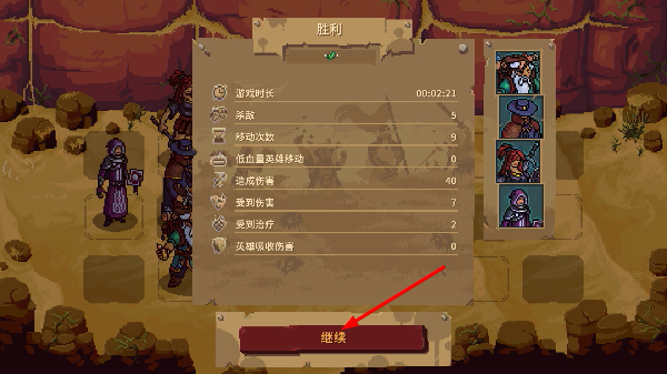 4、通关后查看【胜利】结算界面的战斗数据,点【继续】按钮进入下一段游戏流程。