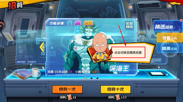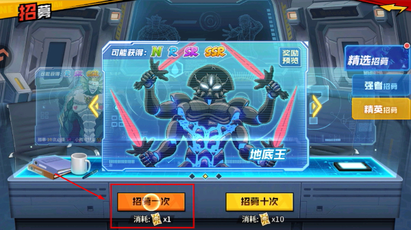 1、在招募界面可切换至精英招募,消耗【徽章】1进行单次招募,有机会获得【深海王】等不同稀有度角色。