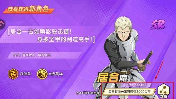 3、获得新角色【居合庵】后,点击炫耀按钮分享,每日首次分享可领取【5000】金币奖励。