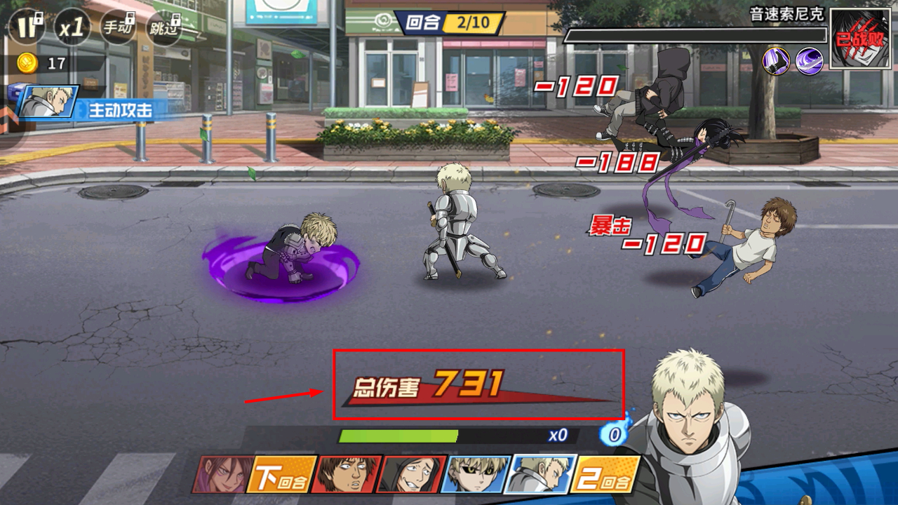 3、使用【拔刀斩】攻击整排敌人,2连击造成120%攻击力加10点伤害,主目标会被破坏2回合免伤率降30%。