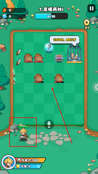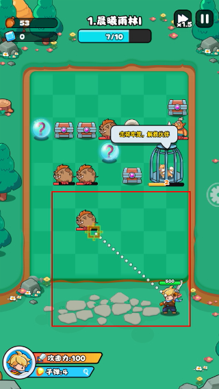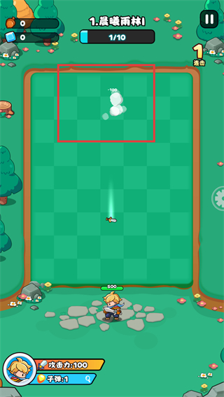 2、战斗初始阶段,角色(攻击力100)在底部区域,上方出现敌方单位,需通过弹射轨迹攻击敌方,累计击败10个单位通关。