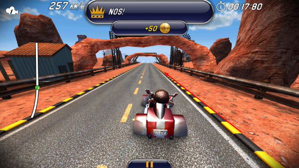 3、在赛道中使用【NOS】功能可大幅提升速度,同时尽量收集赛道上的【金币】,每次收集可获得【50】金币奖励。