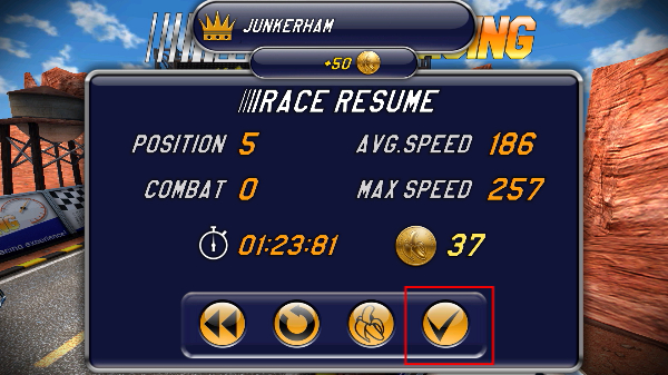 4、比赛结束后会显示【RACERESUME】统计界面,查看成绩后点击下方的【确认】按钮即可完成本局比赛流程。