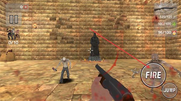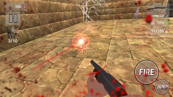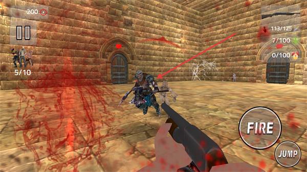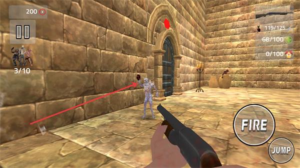 1、瞄准场景中的怪物,点击FIRE键攻击,击败敌人推进关卡,同时留意周围刷新的怪物。