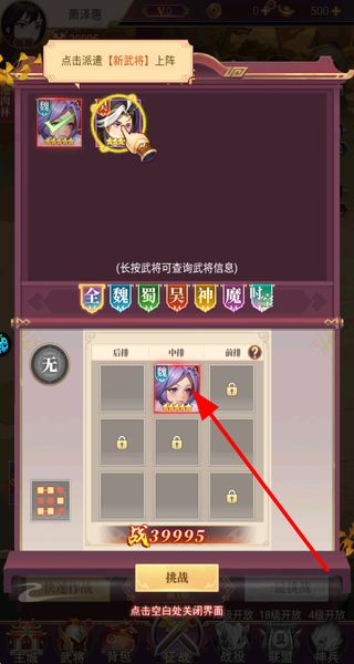 1、选择武将并将其布置到阵容空位中,搭配不同阵营的武将组成军团,确认阵容后点击挑战,即可开启对应的战役关卡。