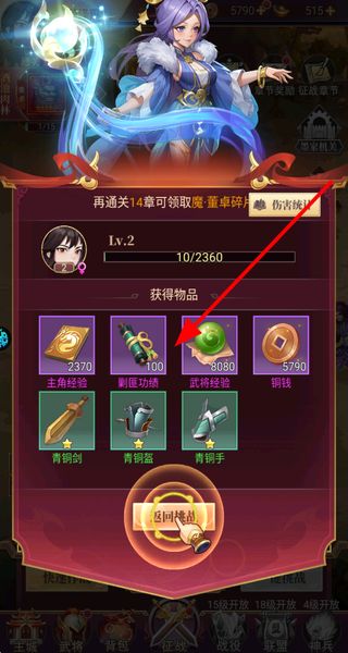 3、通关战役后会获得各类奖励,包括经验铜钱和装备等,领取奖励后点击返回挑战,可继续参与其他战役获取更多资源。