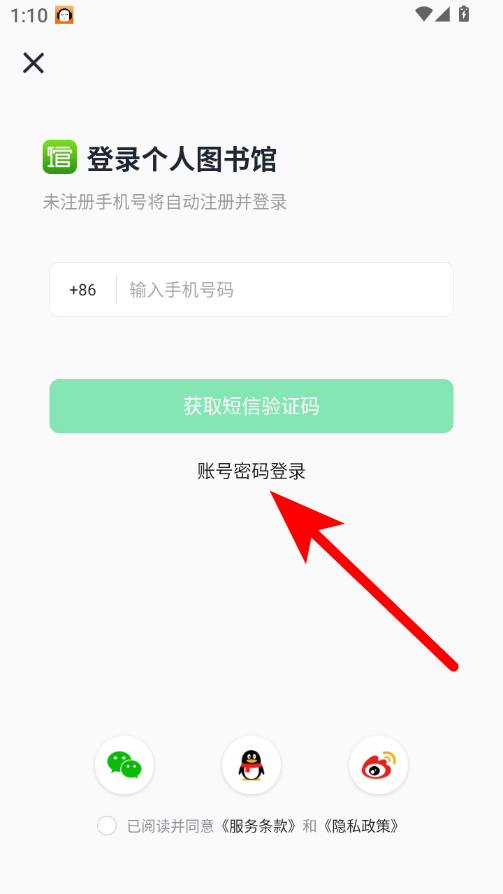 2、在登录页面,点击账号密码登录选项,进入密码登录界面。