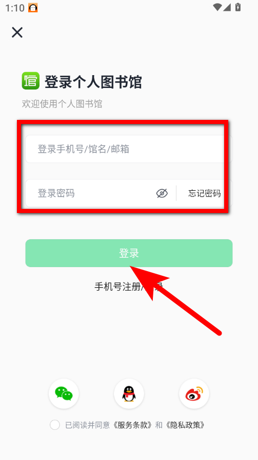 3、在密码登录界面,输入登录手机号/馆名/邮箱和登录密码即可。