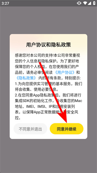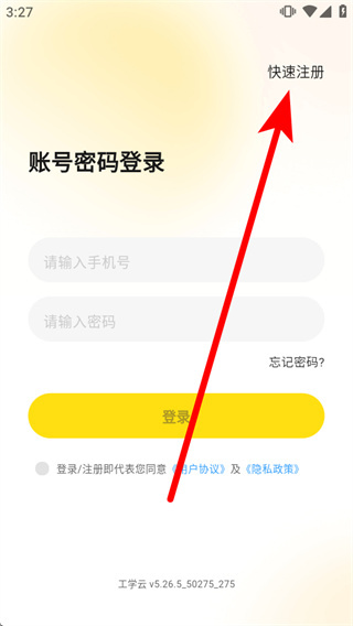 1、打开工学云,弹出弹窗后,点击同意并继续,进入账号密码登录页面。