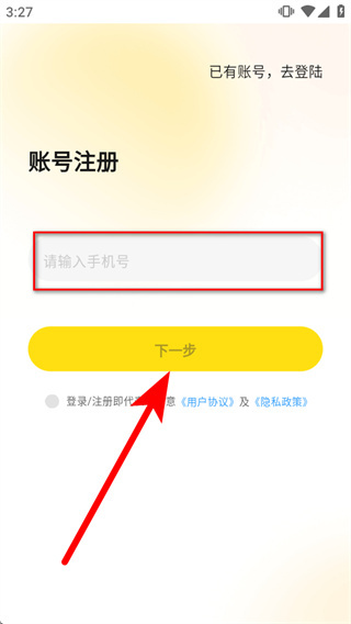 3、在账号注册页面的手机号输入框中填写手机号码,勾选协议选项后,点击下一步。