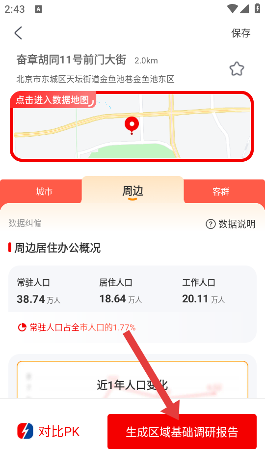 2、在区域调研详情页面,查看数据后,点击底部调研报告按钮,弹出确认框。