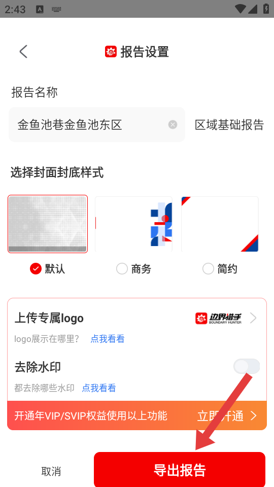 4、在报告设置页面,选择封面封底样式等,点击导出报告按钮,完成报告导出。