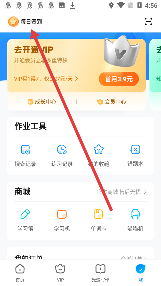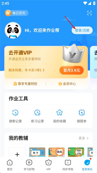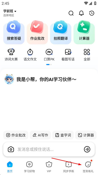 1、打开作业帮应用,在首页找到签到有礼选项,点击该选项进入签到有礼界面。