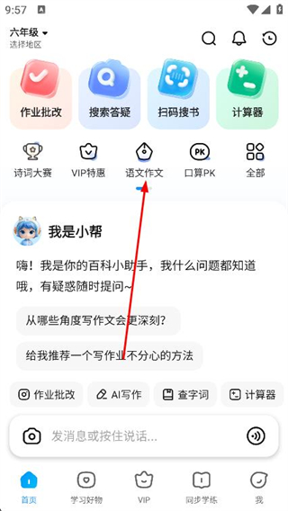 1、打开作业帮APP,在首页找到语文作文并点击。