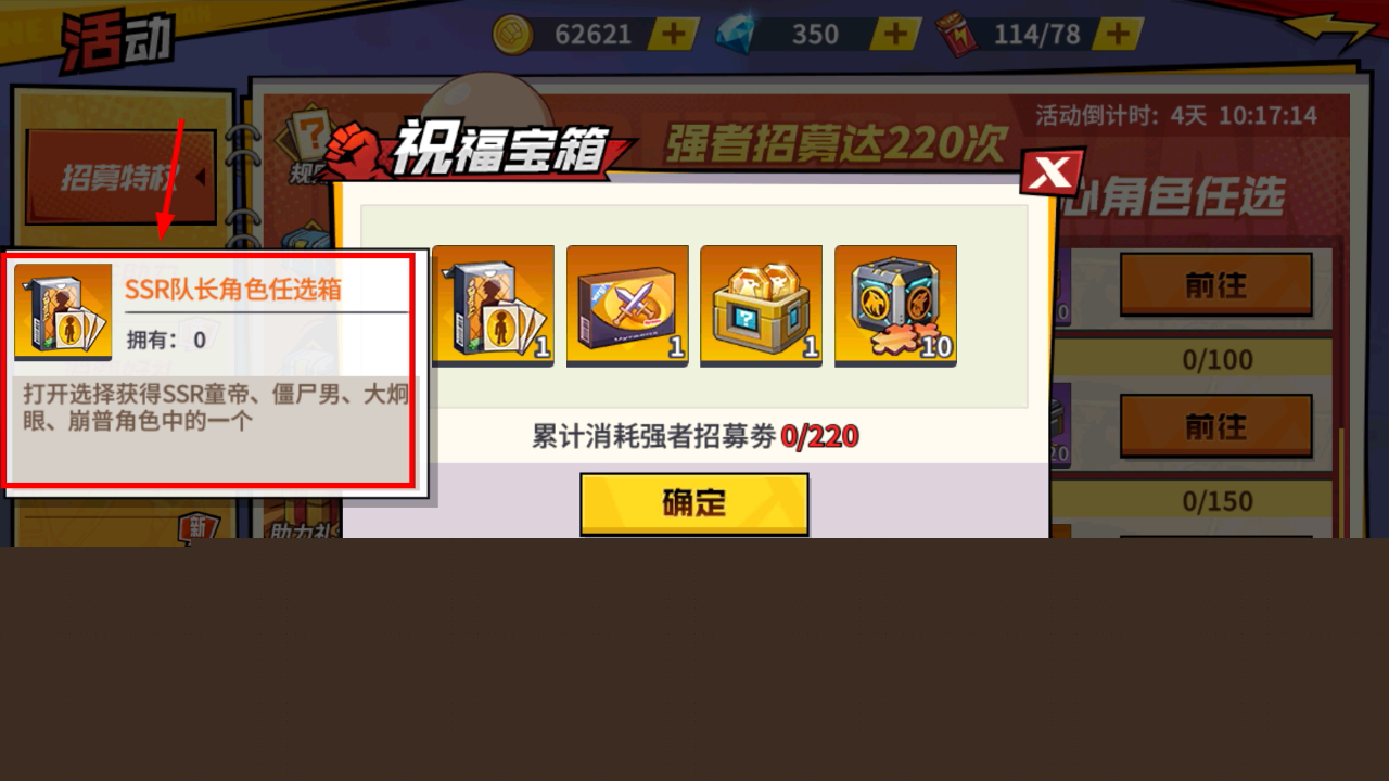 1、参与强者招募累计消耗【强者招募券】达220,可开启【SSR队长角色任选箱】选择【童帝】-【僵尸男】-【大眼】-【崩普】其一。