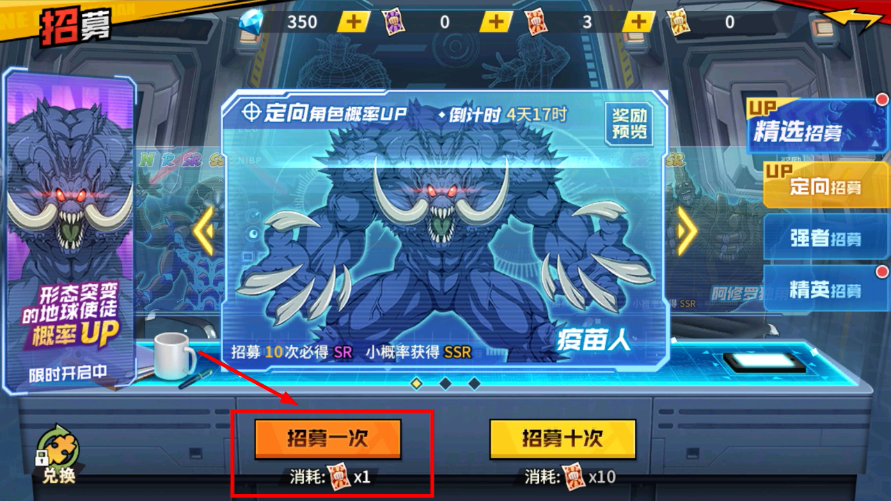 3、定向角色概率UP活动中,消耗对应道具点【招募一次】或【招募十次】,十次招募必得【SR】角色。