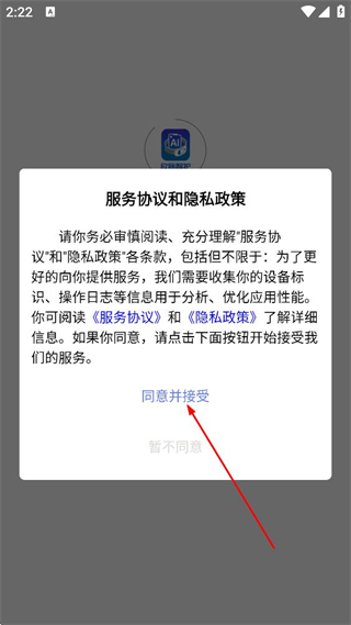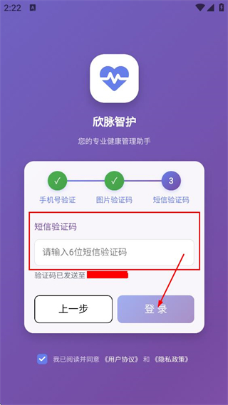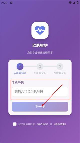 1、阅读服务协议和隐私政策后,点击同意,进入欣脉智护的验证页面。