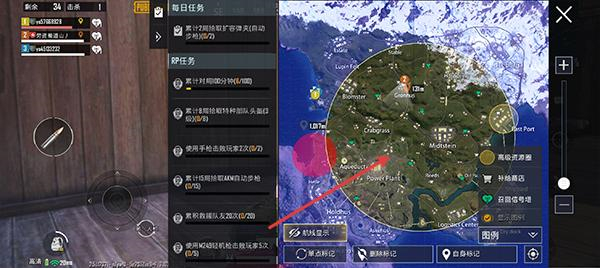 4、关注界面的任务指引,根据地图标记的目标区域移动,途中利用建筑隐蔽自己,同时淘汰遇到的对手。