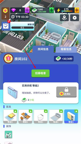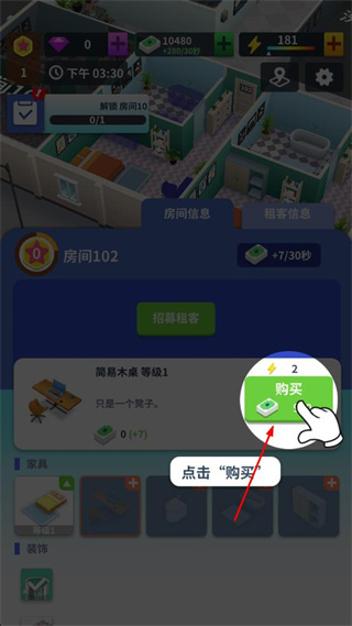 3、进入房间信息页面,找到需要添置的家具,点击该家具对应的购买按钮,完成家具购买。
