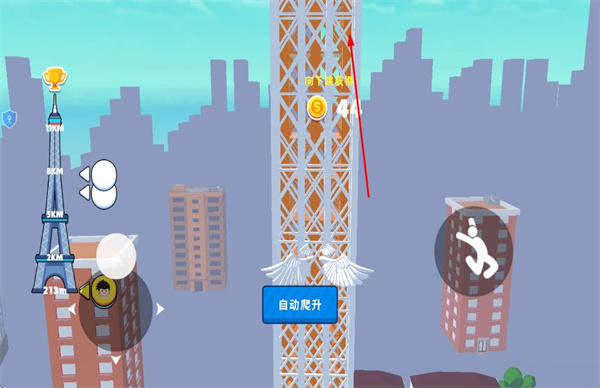 3、攀爬过程中,找到自动爬升按钮,点击该按钮,让角色自动沿着建筑结构持续向上攀爬。