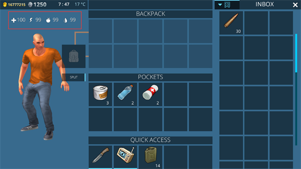 2、打开【BACKPACK】界面,管理【POCKETS】中的物资,快速调用常用道具。