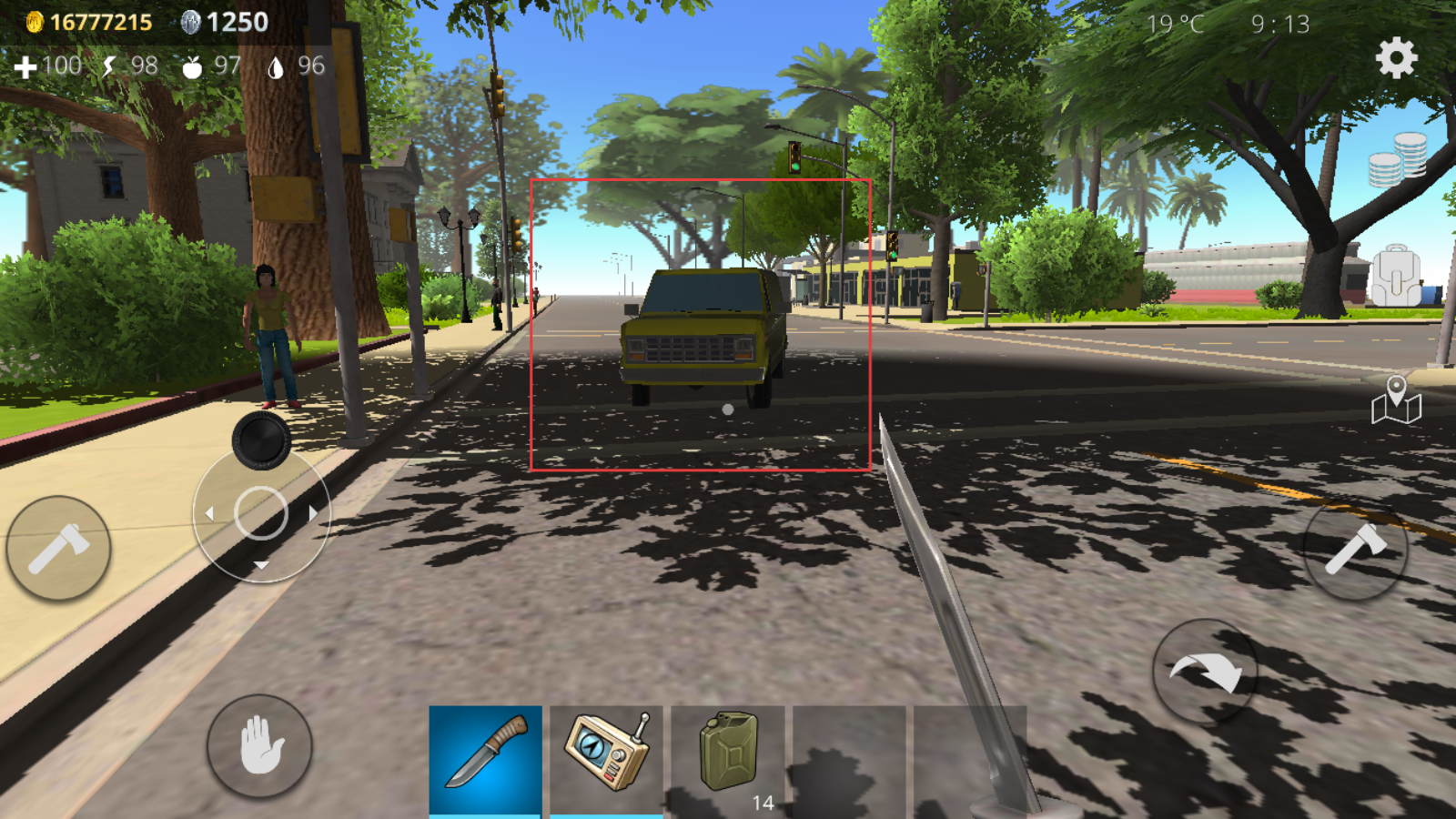 2、切换【匕首】道具后,可通过界面右侧按键采集物资,借助场景中的树木等元素获取生存材料。