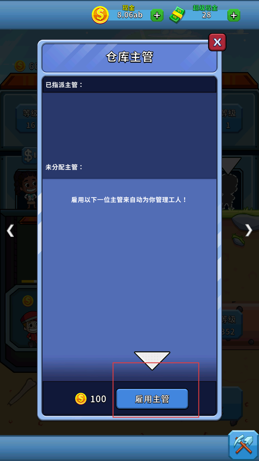 1、初期花费100金币雇佣仓库主管,可自动管理工人,助力挖矿效率提升。